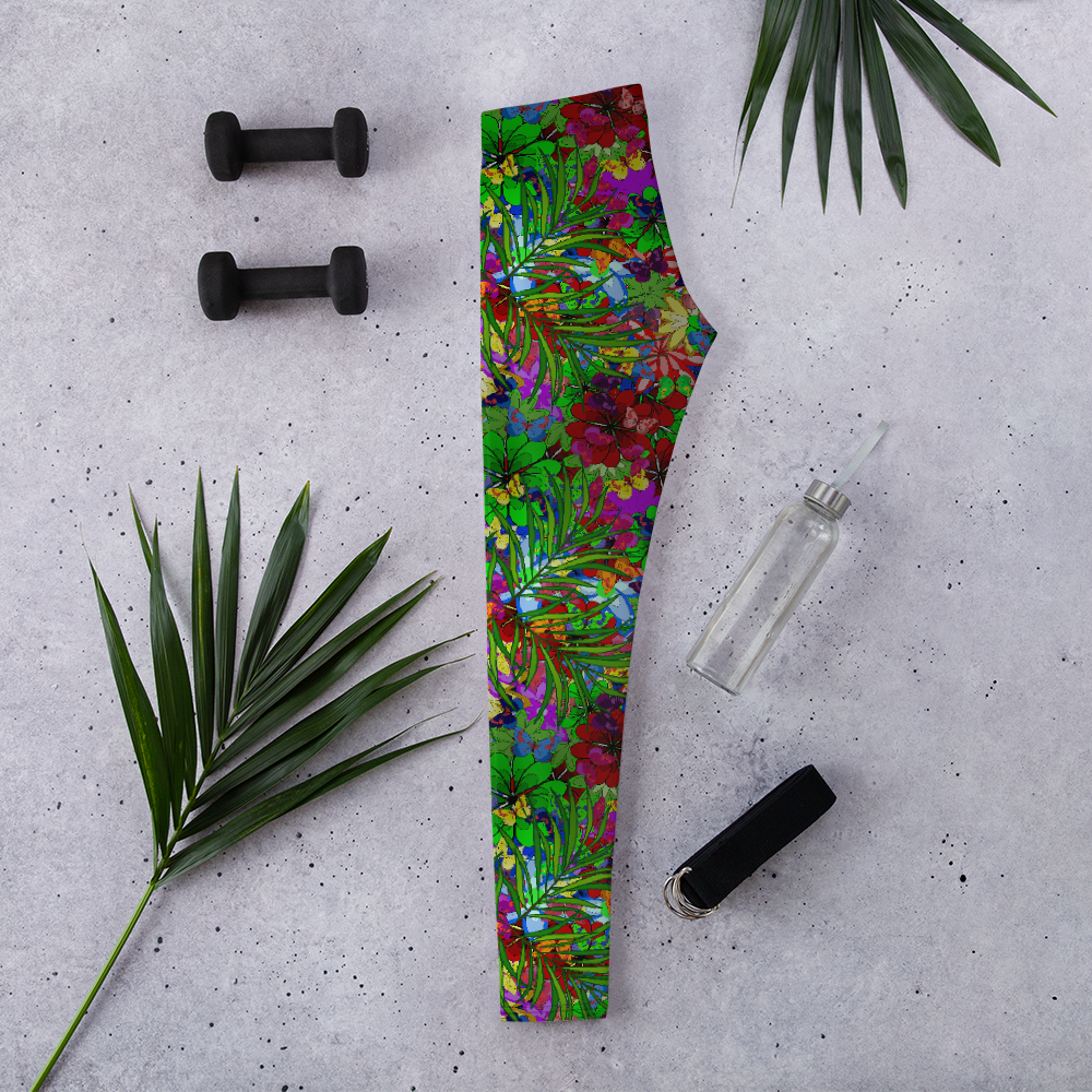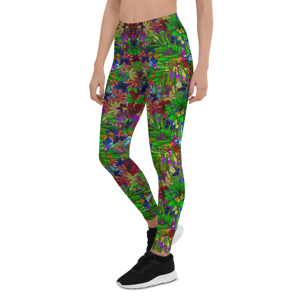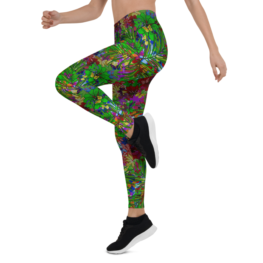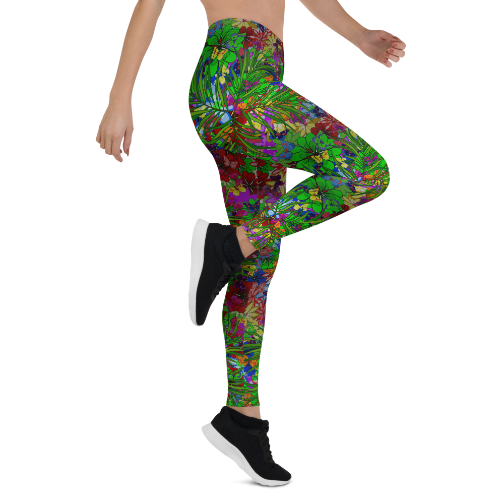Green Floral Leggings, Jungle Flowers Leggings Gym Workout Printed Yoga Pants