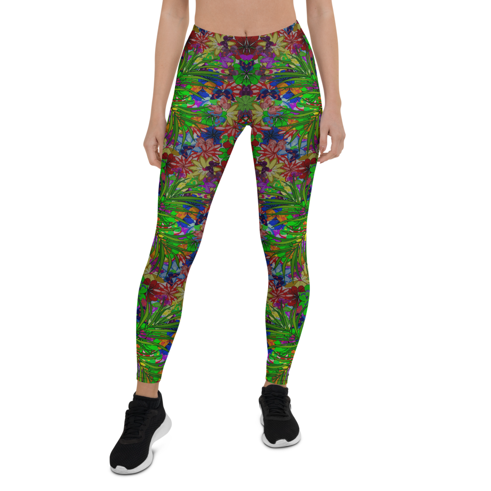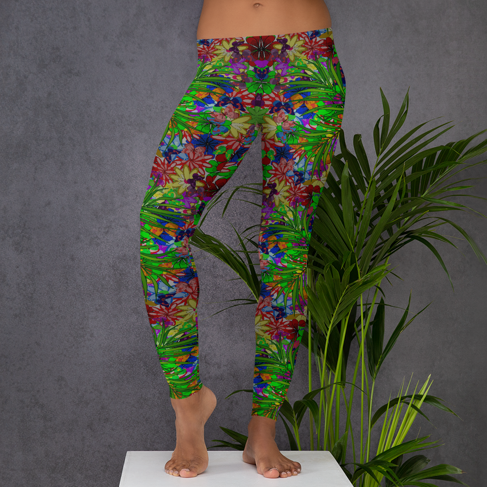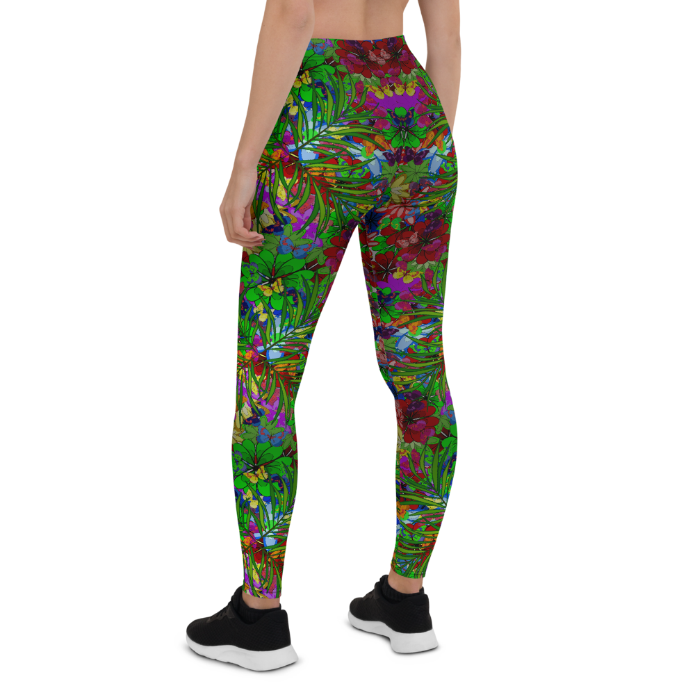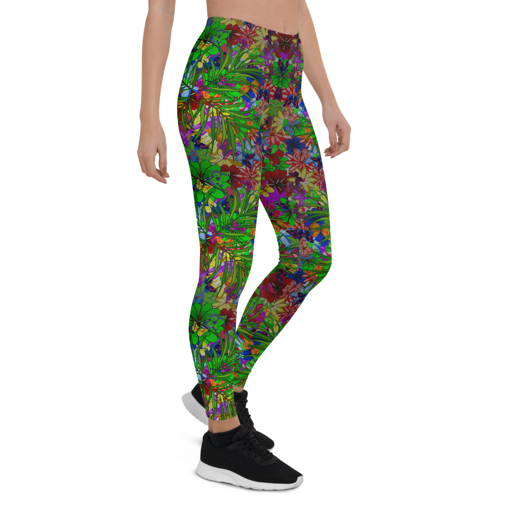Green Floral Leggings, Jungle Flowers Leggings Gym Workout Printed Yoga Pants