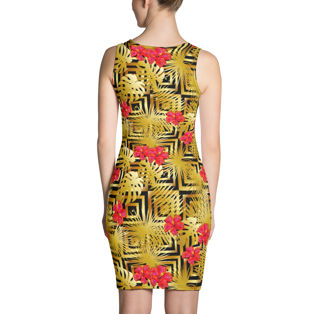 Tropical Gold Luxury Palm Leaves and Hibiscus Flowers Dress