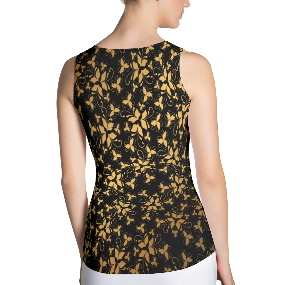 Vibrant Gold Floral Ornaments Fashion on Black Tank Top - Bright Nova Tank Tops